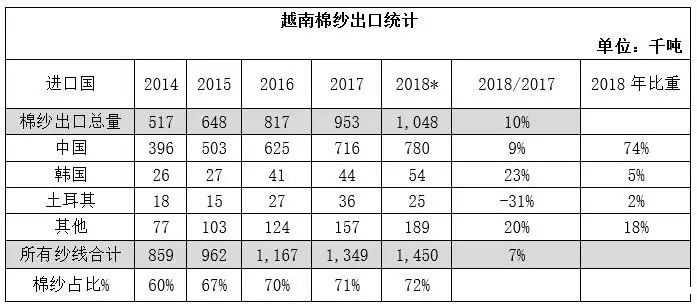中美贸易战开始之时,越南纺织业曾经非常担心中国服装对美国出口大幅减少,那会导致中国对越南棉纱进口大幅下降,但目前来看中美贸易战并没有给越南棉纱对中国出口带来负面影响。据越南海关统计,2018年越南棉纱对中国出口预计达到78万吨,同比增长9%。同时越南纺织业国内外投资继续增加。